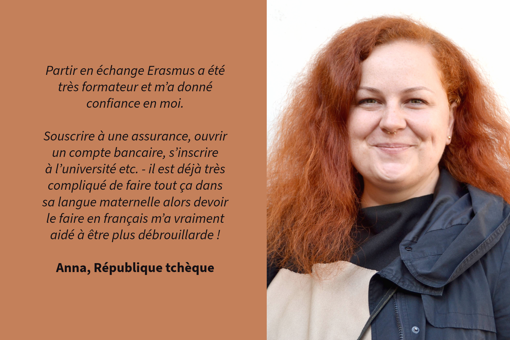 Partir en échange Erasmus a été très formateur et m’a donné confiance en moi. Parler une autre langue, s’inscrire dans une université étrangère, souscrire à une assurance, ouvrir un compte bancaire, demander l’aide au logement… – il est déjà très compliqué de faire tout ça dans sa langue maternelle alors devoir le faire en français m’a vraiment aidé à être plus débrouillarde !