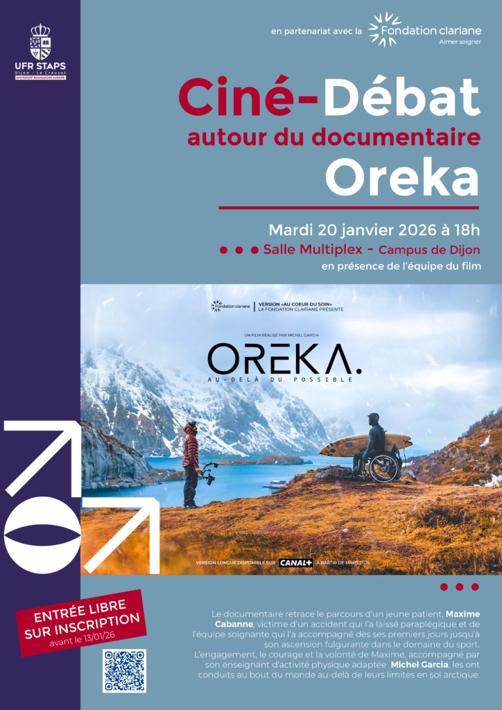 L’UFR STAPS Dijon-Le Creusot, en partenariat avec la Fondation Clariane, vous invite à la projection du documentaire Oreka, le mardi 20 janvier 2026 à 18h à la Multiplex sur le campus de l’Université Bourgogne Europe.