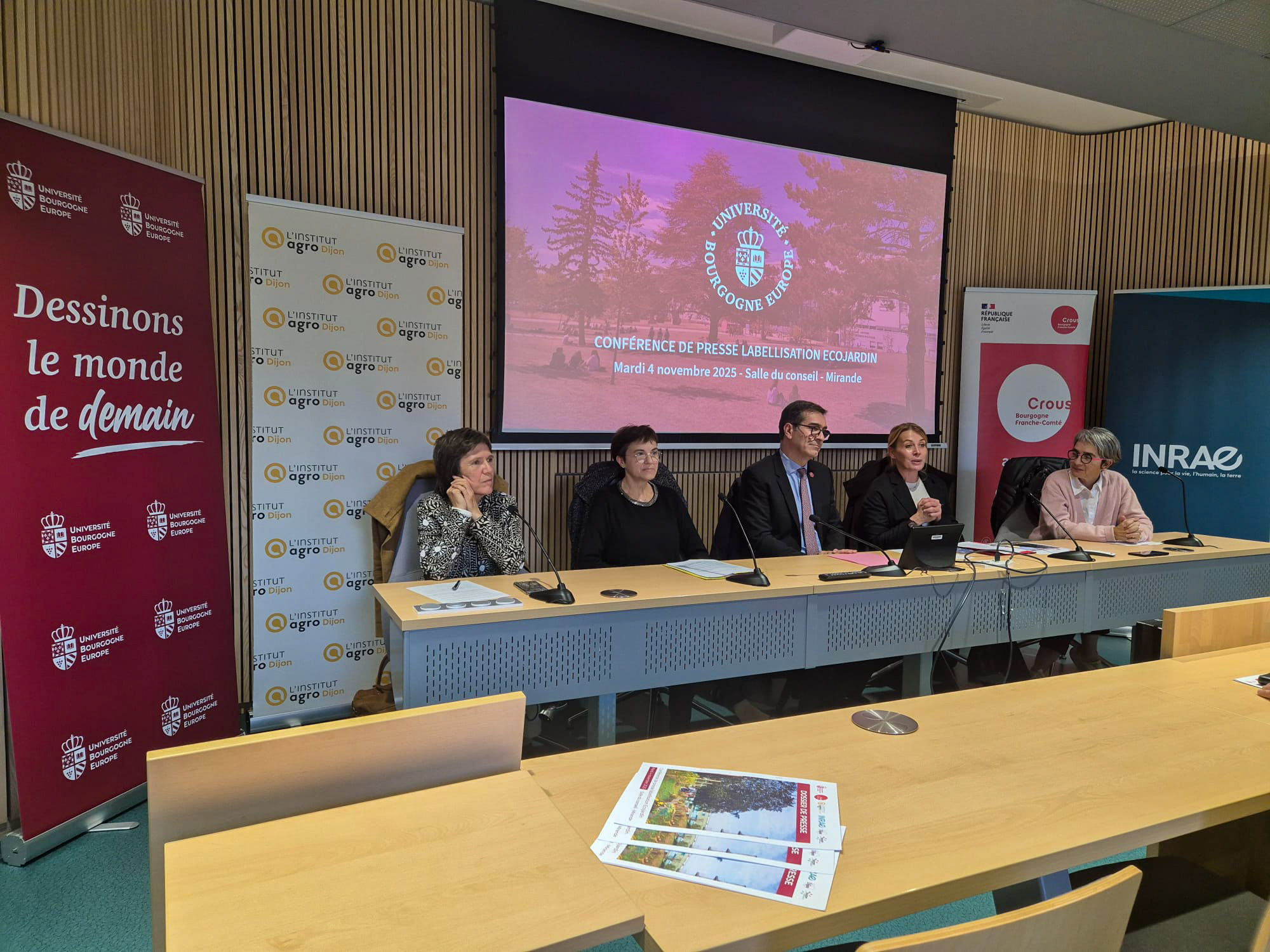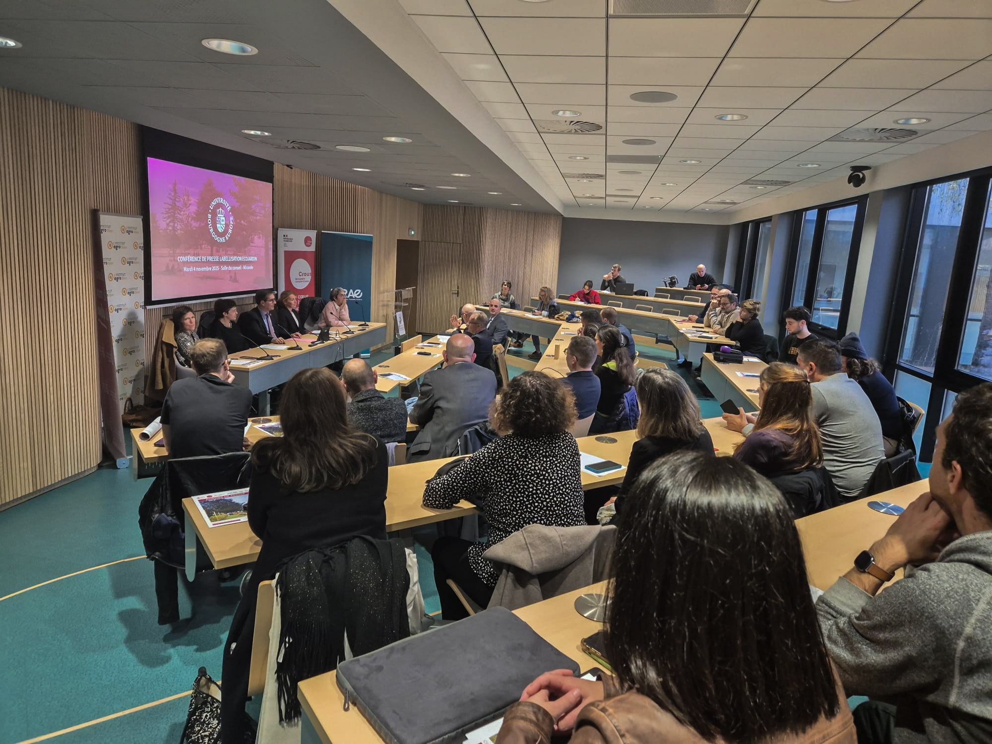 On Tuesday, 4 November, the University of Burgundy Europe held a press conference to announce that it had been awarded the EcoJardin label, a national distinction that recognises the ecological and responsible management of green spaces. The event brought together representatives from the university’s management, technical teams, institutional partners and several local media outlets.