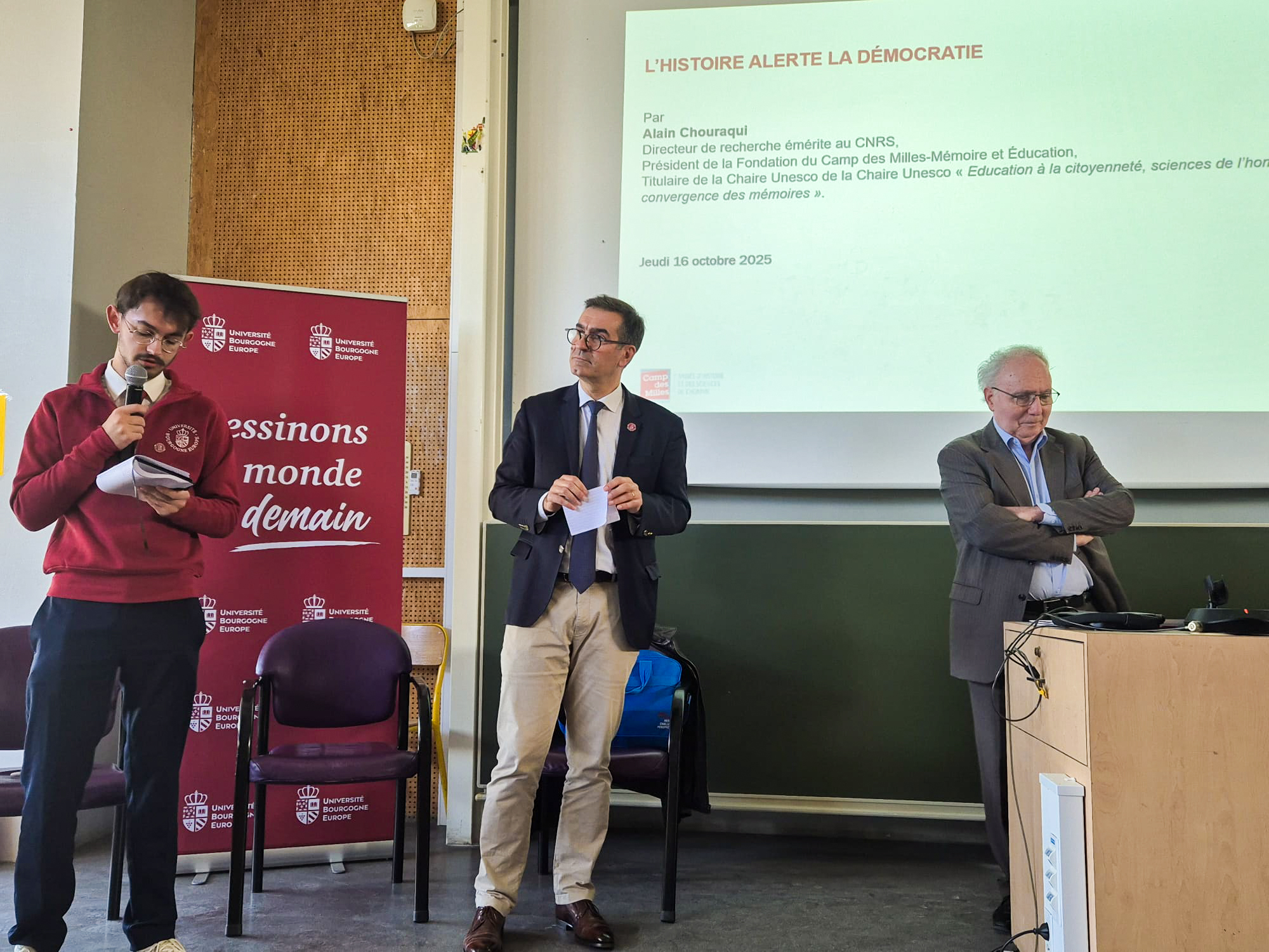 Jeudi 16 octobre, pour sa deuxième édition de la Journée Laïcité et Tolérance, l’Université Bourgogne Europe a accueilli Alain Chouraqui, chercheur français, Directeur de recherche émérite au Centre national de la recherche scientifique (CNRS), Président-fondateur de la Fondation du Camps des Milles – Mémoire et éducation, Titulaire de la Chaire Unesco « Éducation à la citoyenneté, sciences de l’Homme et convergences des mémoires ».
