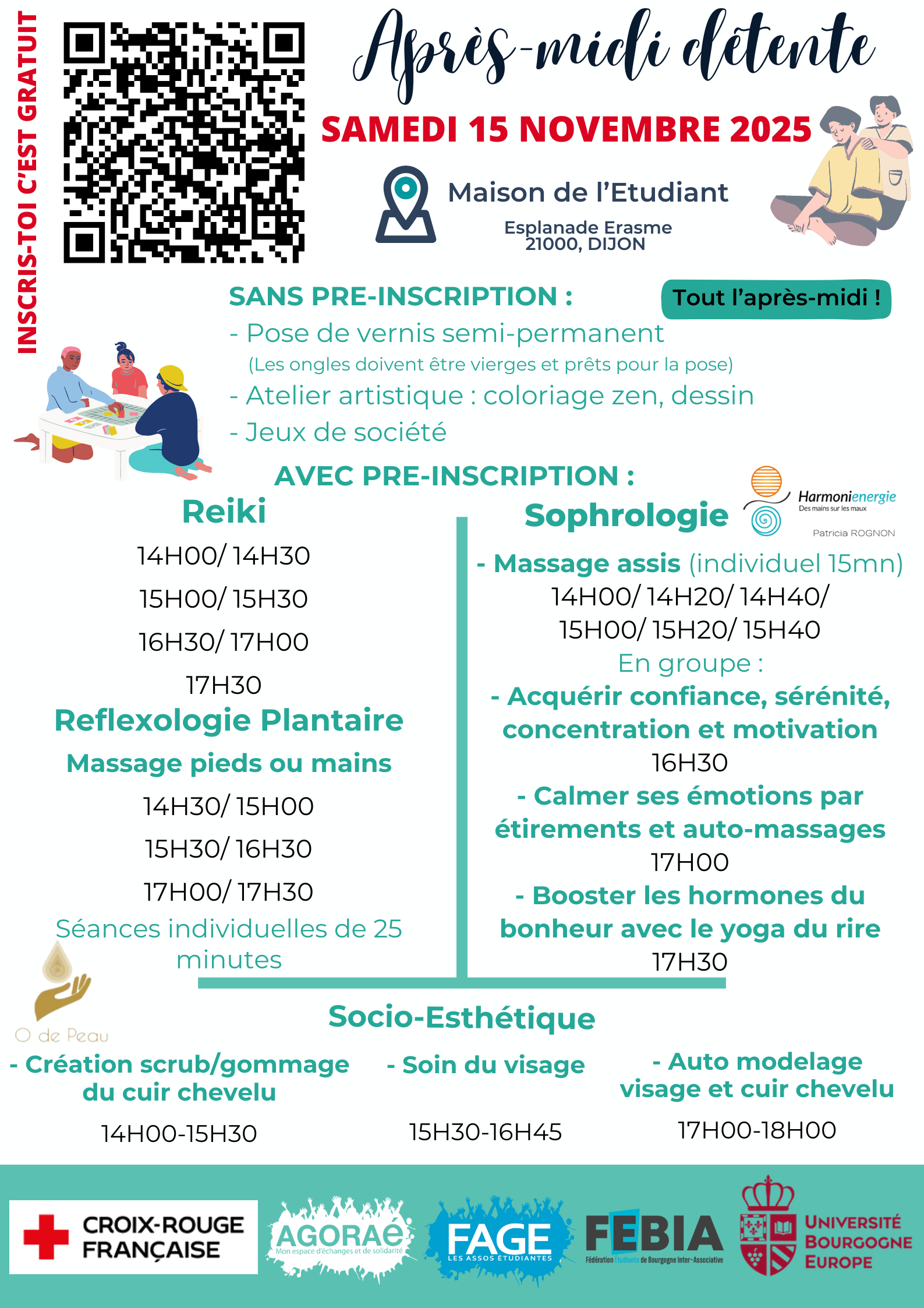 Comme tous les mois, la Croix-Rouge organise un après-midi de bien-être et de détente sur le campus universitaire. Un évènement gratuit et ouvert à tous les étudiants de l’UBE. Activités artistiques, séance de réflexologie plantaire, sophrologie, massages, reiki et même atelier de jeux de société ; tout est à la portée des étudiants pour passer un moment de partage et de détente.